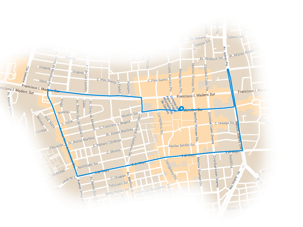 Después de avanzar por Francisco I. Madero, se gira al sur por Av. Virrey de Mendoza, pasando por calles como Suiza y Dr. Alonso Martínez. La ruta continúa hacia el oriente por Apatzingán Sur, ofreciendo una sección recta ideal para recuperar tiempo.